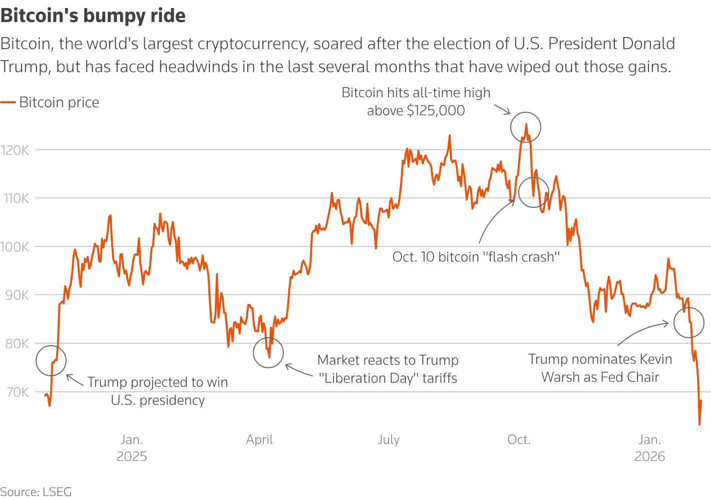Bitcoin, que había sido uno de los grandes beneficiados del “Trump pro-cripto” (grupo de trabajo presidencial, veto a las CBDC, apoyo explícito a stablecoins) venía de marcar máximos históricos cerca de los 125.000 dólares a finales de 2025.