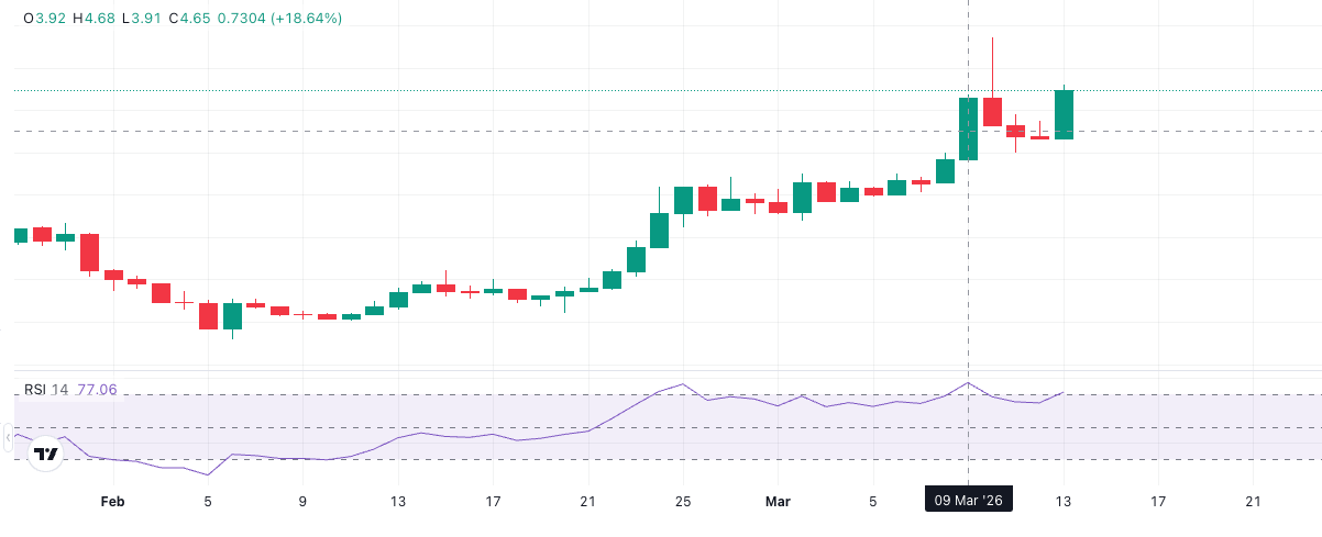 El 8 y 9 de marzo, DEXE pega un subidón del 28%. El volumen se dispara, la narrativa de gobernanza descentralizada empieza a ganar atención y el precio roza los 5,25 dólares. En redes, todo el mundo hablando de DEXE.